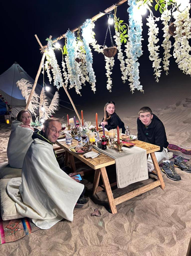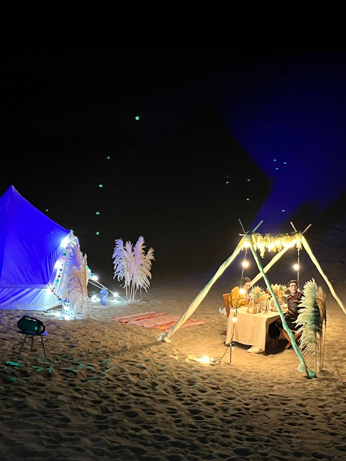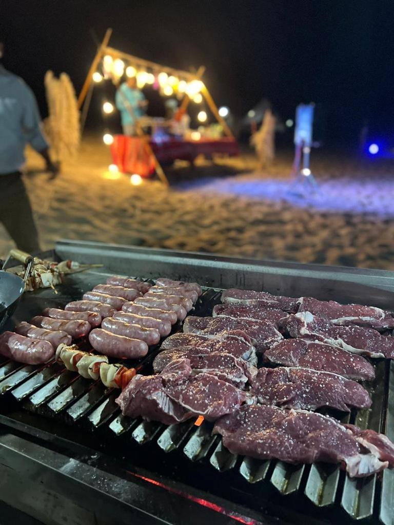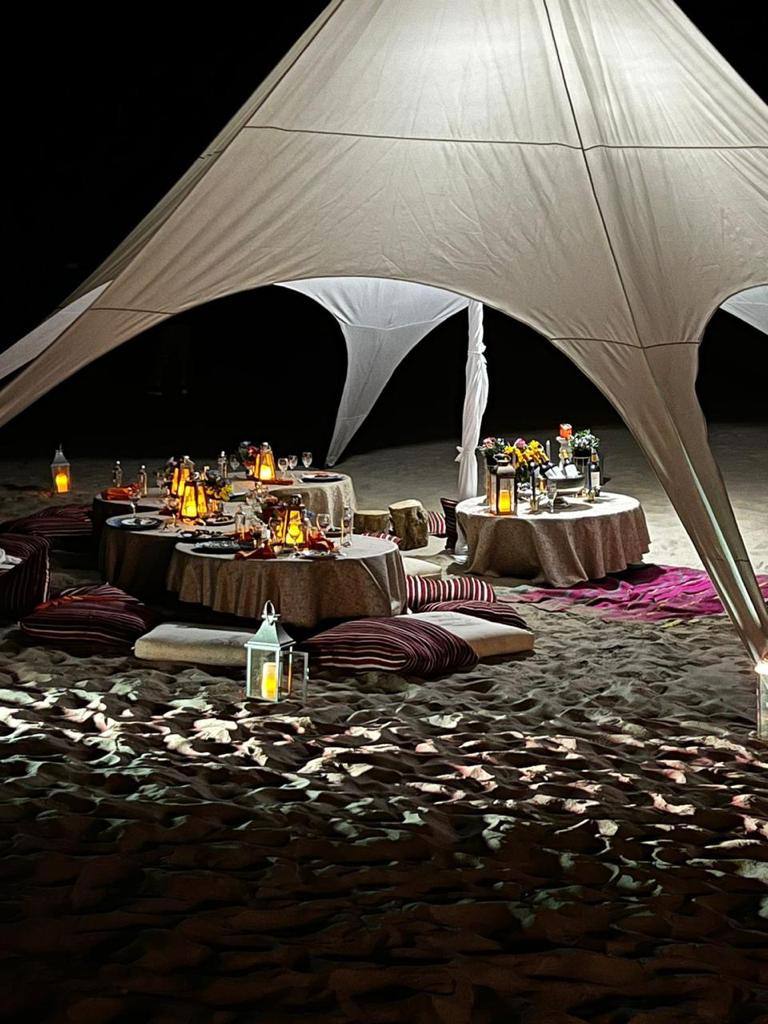Cuando el sol se despide lentamente en el horizonte, llegamos a nuestro campamento privado, ambientado con todos los detalles para crear una atmósfera íntima, cálida y acogedora. Las carpas bell tent decoradas con luces, flores, cojines y alfombras, y el toldo estrella para grupos grandes, crean un espacio que mezcla la rusticidad del desierto con la comodidad que mereces. Música suave, fogata encendida y el cielo pintado de estrellas completan la escena.